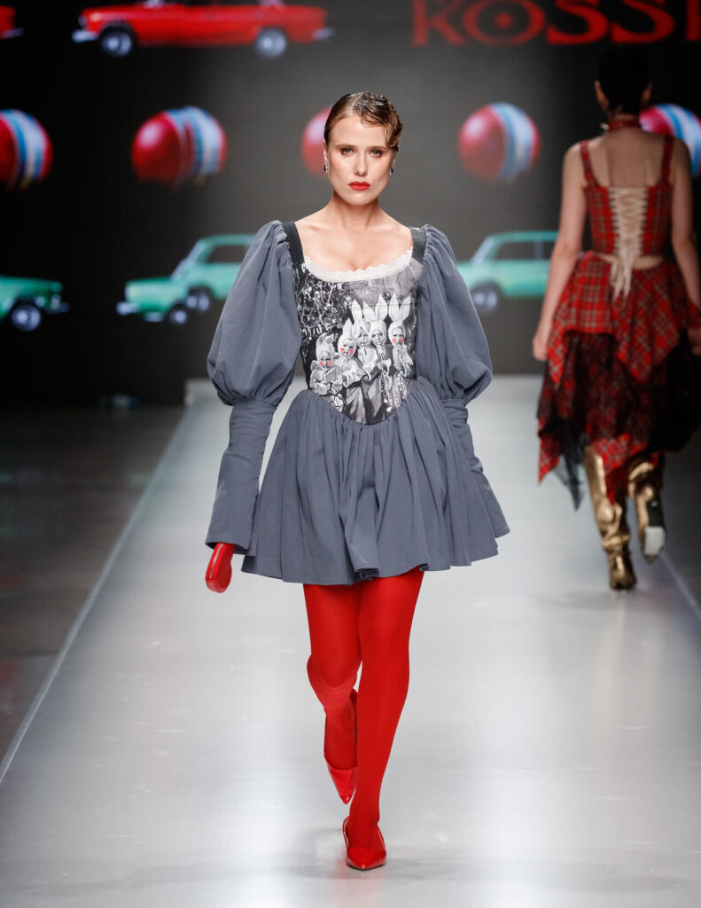 Koss Koss took inspiration from the nostalgic atmosphere of a Soviet autumn resort. We especially liked the spike chokers, deconstructed cuts, vibrantly coloured tights, and elegant dresses which made for a juxtaposition of styles that blended harmoniously.