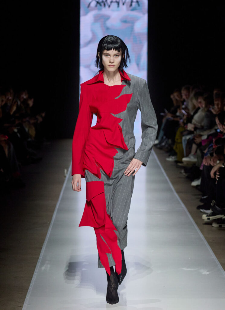 The tribute show to the late Russian fashion designer Yegor Zaitsev showcased two collections, STAR.OST and NEW G’LOOK, which were originally designed in 2010. Zaitsev’s presentation provided a deeply emotional experience, blending stylish innovation with futuristic and avant-garde elements that represented the conflict between darkness and light.