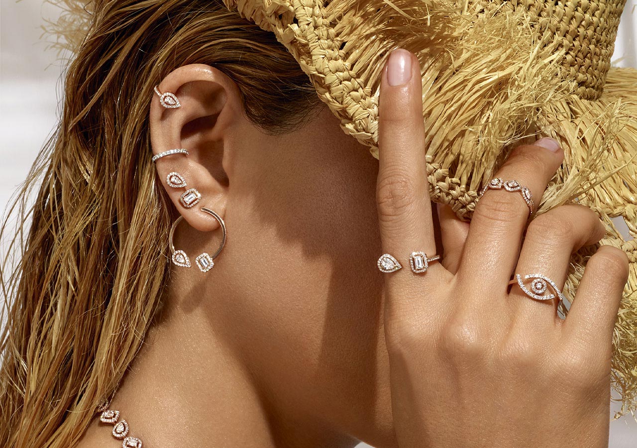 The style that the designer has put together is all about stacking, mixing, and matching Messika sets of earrings in a modern way. A current trend consists of wearing jewels along the auricle of the ear. The lobe is no longer the only part of the ear to shine with diamonds.