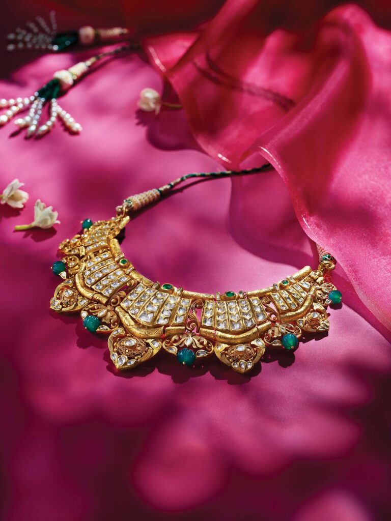 Highlights include an 18 Karat yellow gold necklace set featuring striking red stones, intricate floral Kundan elements, and a detachable pendant, all reflecting grace and ambition. Crafted over 45 days, the collection also includes a 22 Karat yellow gold necklace adorned with peacock feather motifs and an innovative ombre of green Kundan, striking a balance between timeless elegance and modern vibrancy. With detailed enamel work and ornate jali designs cradling captivating green stones, another piece symbolizes the strength and multifaceted nature of women who gracefully juggle various roles in their lives.