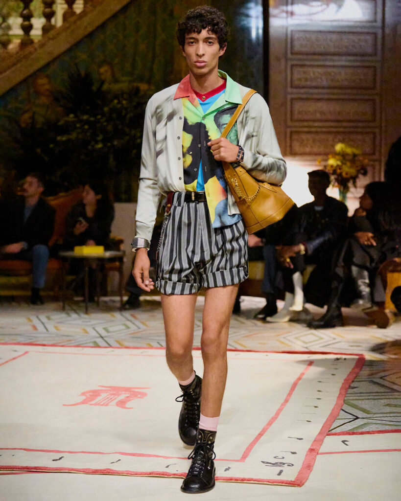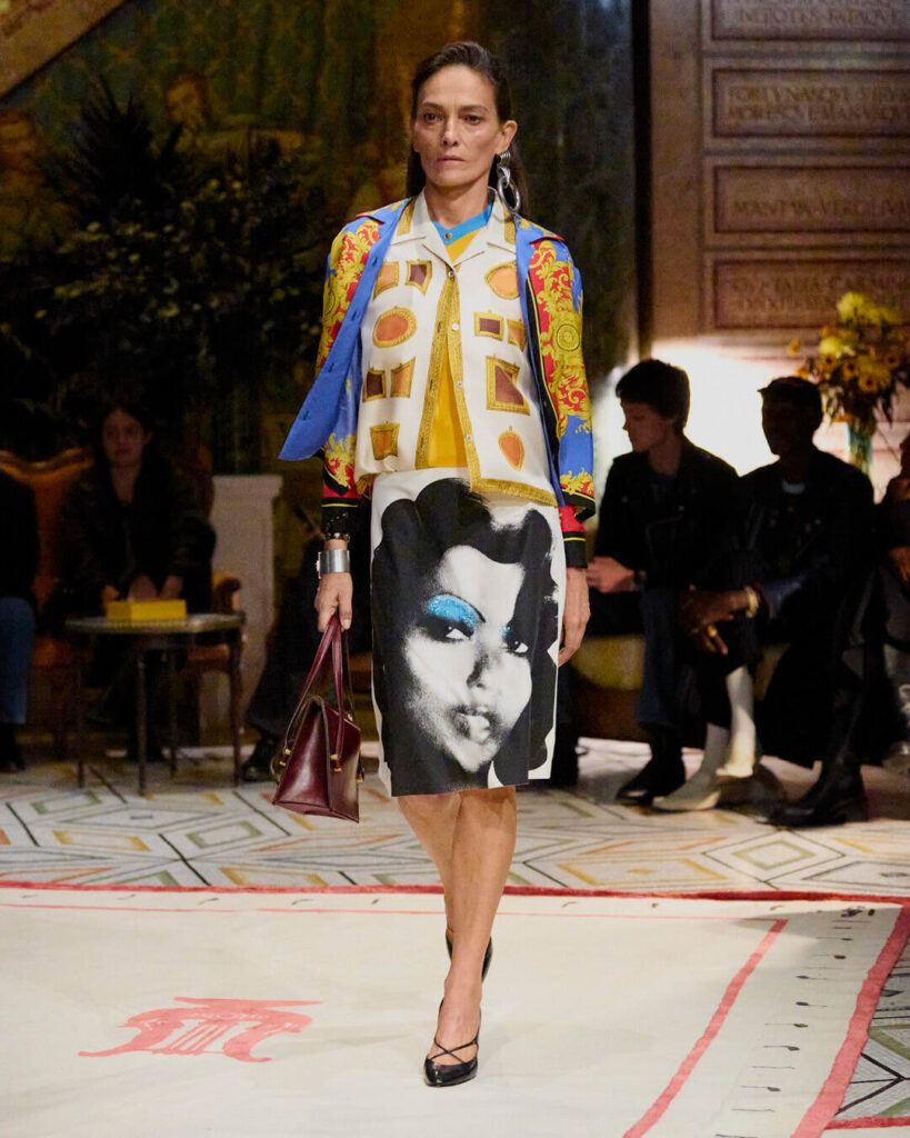 The Versace presentation bridges iconic heritage with a distinctly modern attitude, where refinement meets instinct and sensuality flows through every detail. Archival codes — tailoring, denim, printed shirting, leather, and lingerie — are reimagined with a lived-in ease and layered complexity. Striped denim in sun-faded tones, patched leather blousons, mixed-metal dresses, and vivid, House-rooted prints reflect a Mediterranean vibrancy and a streetwise sensibility. Beading and sculptural draping speak to indulgent glamour, while silhouettes are styled to suggest movement, intimacy, and unspoken desire.