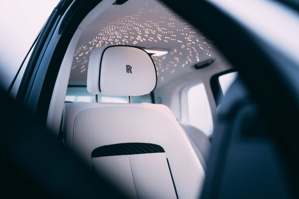 The interior is finished in Arctic White and Navy Blue leather, with contrast stitching, piping and headrest monograms in Navy. The seat inserts feature a Bespoke rigging pattern, hand-stitched in diagonal bands using Rolls-Royce’s signature thread. Created by an artisan with a personal connection to the Royal Navy, and trained in yarn, weave and embroidery construction, the piece has been carefully orchestrated to echo the twining of rope, where multiple strands are twisted together to create strength. The direction of each stitch reflects this structural composition, elegantly translating the craft of nautical ropework into embroidery. A rope motif also appears on the illuminated treadplates, visible when opening the coach doors.