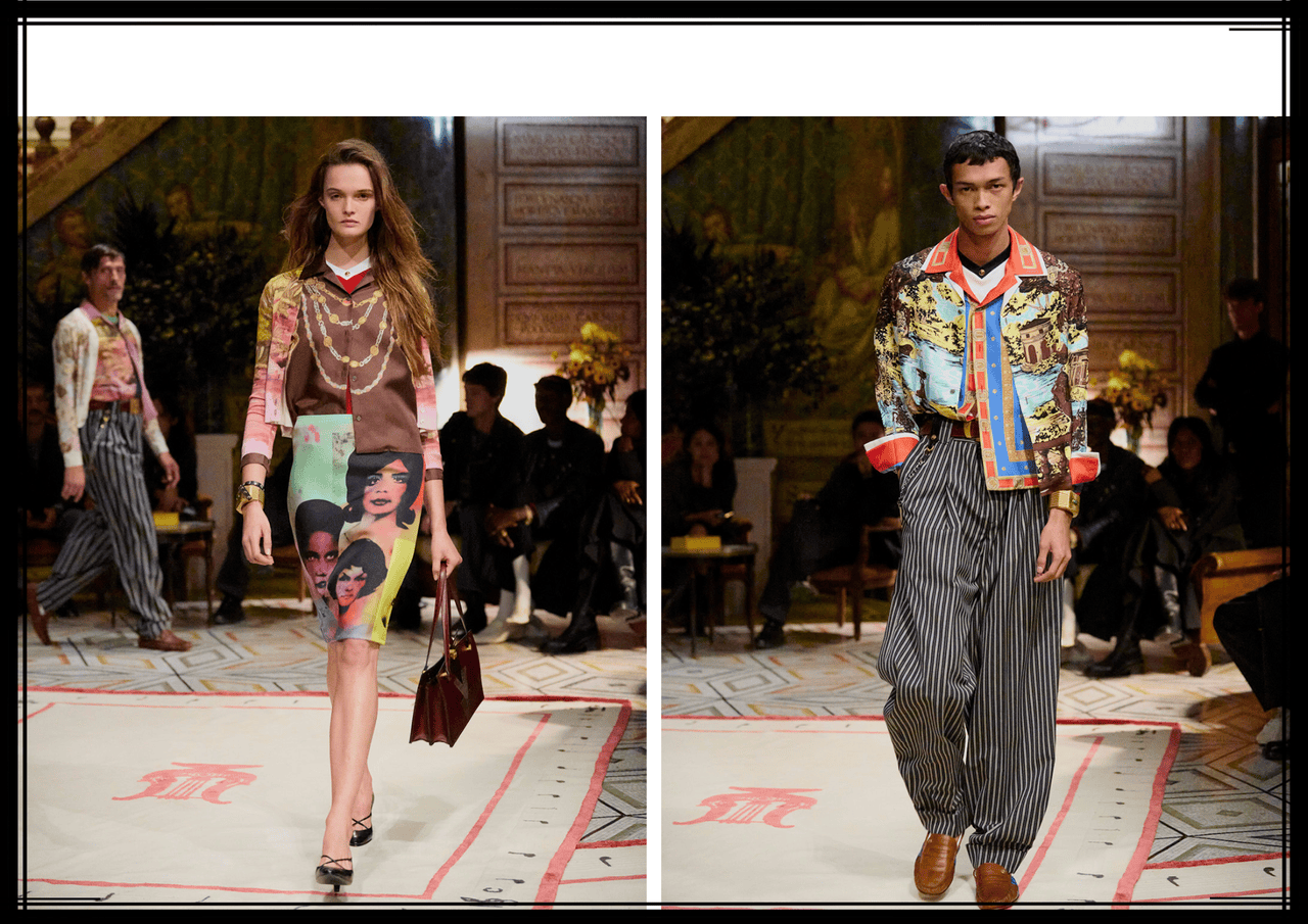 The Versace presentation bridges iconic heritage with a distinctly modern attitude, where refinement meets instinct and sensuality flows through every detail. Archival codes — tailoring, denim, printed shirting, leather, and lingerie — are reimagined with a lived-in ease and layered complexity. Striped denim in sun-faded tones, patched leather blousons, mixed-metal dresses, and vivid, House-rooted prints reflect a Mediterranean vibrancy and a streetwise sensibility. Beading and sculptural draping speak to indulgent glamour, while silhouettes are styled to suggest movement, intimacy, and unspoken desire.