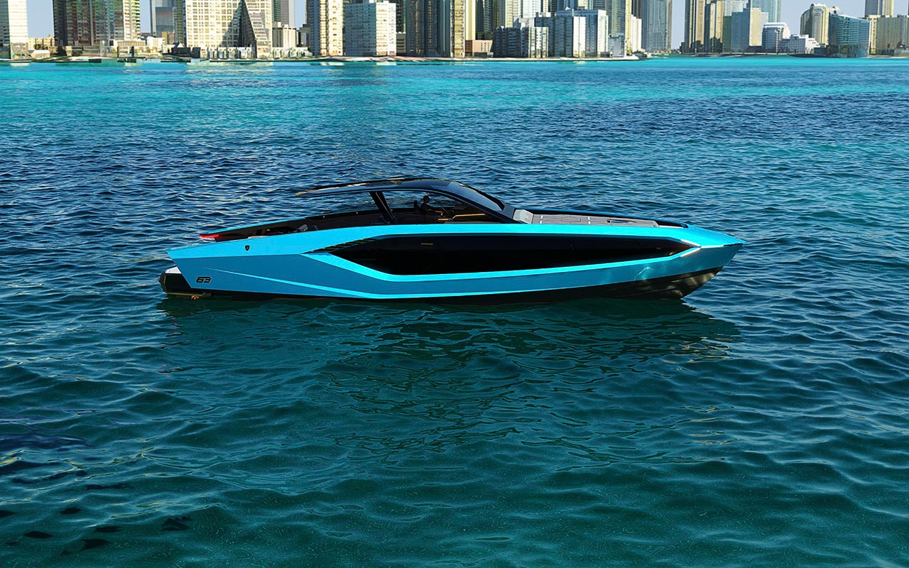 The exterior design is characterized by a super sportive silhouette, with the edgy styling one would expect. The hull and the superstructure are created from a high-performance shell, developed by naval engineers specializing in hydrodynamic sciences. They interpret the design lines, created by Marcello Gandini in the Miura and the Countach of the 60s and 70s, in a contemporary way. The hard top is inspired by Lamborghini roadsters: providing sun and wind protection while guaranteeing an outstanding aerodynamic performance. The bow lights are an homage to the Lamborghini concept car Terzo Millennio and to the Sián FKP 37, both distinctive for their Y-shaped front lights.